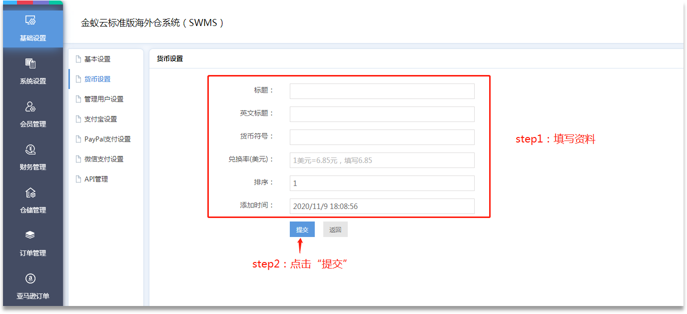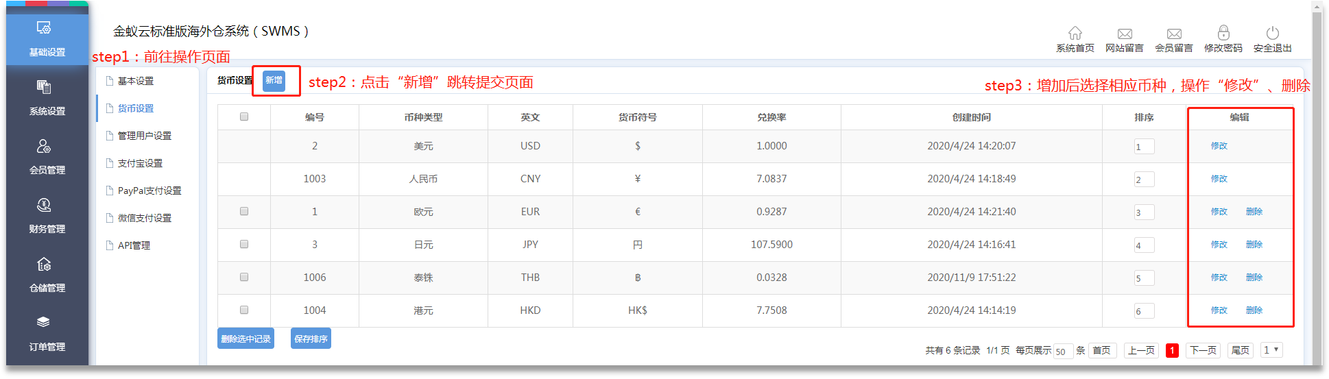 ·前往【基础设置】-【货币设置】,可在此页面进行货币账户的增加、修改、排序及删除。