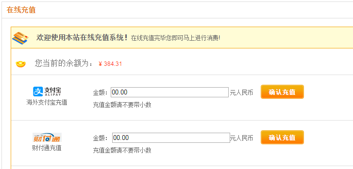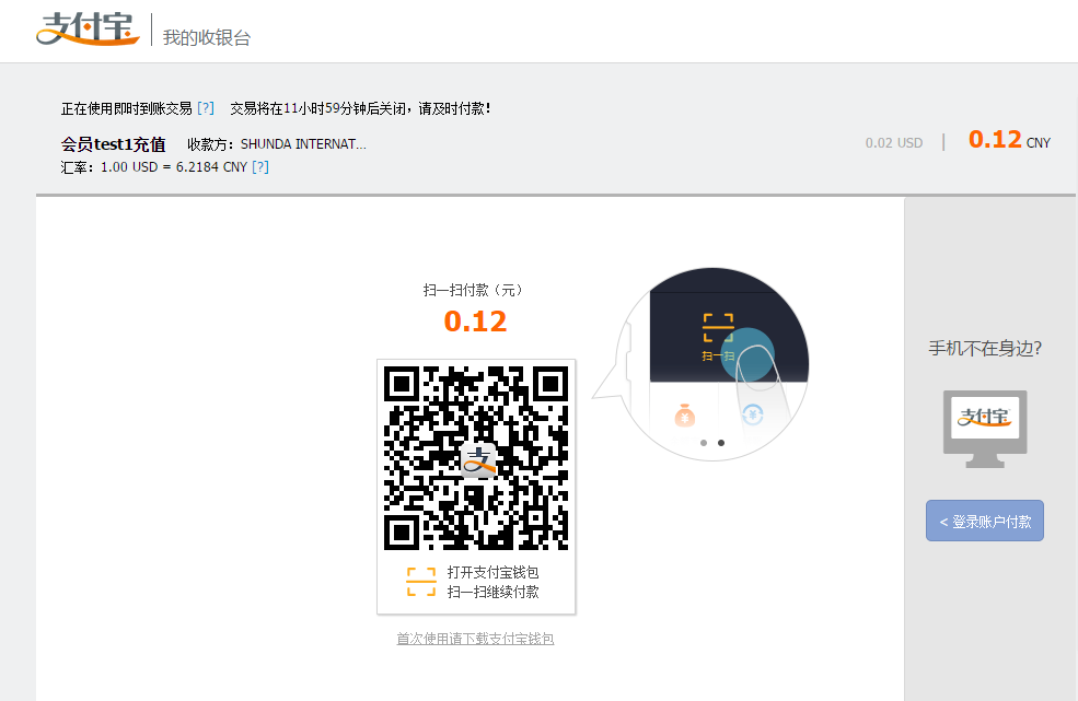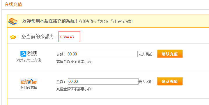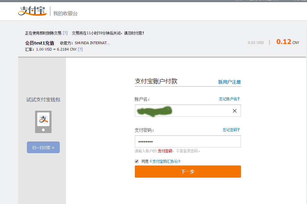第1步: 登陆会员中心后,在在线充值页面的 海外支付宝充值的金额里输入要充的金额, 以下为充值0.12元举例.
